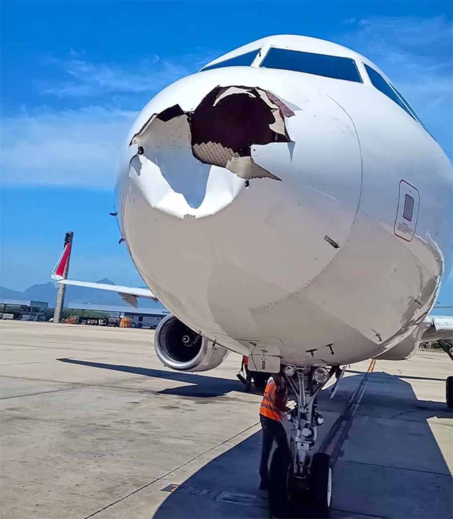ब्राजील में एक बड़ा विमान हादसा टल गया है। गुरुवार को रियो डी जनेरियो से साओ पाउलो जा रहे LATAM एयरलाइन्स के A321 विमान को एक पक्षी से टकराने के बाद आपातकालीन लैंडिंग करानी पड़ी। इस टक्कर से विमान का अगला हिस्सा बुरी तरह क्षतिग्रस्त हो गया। हादसे के बाद सामने आई तस्वीरों में प्लेन की नोज (सामने का हिस्सा) पूरी तरह से क्षतिग्रस्त नजर आ रहा है। इससे साफ है कि विमान को काफी नुकसान हुआ है और ये बड़े हादसे की वजह बन सकता था।
