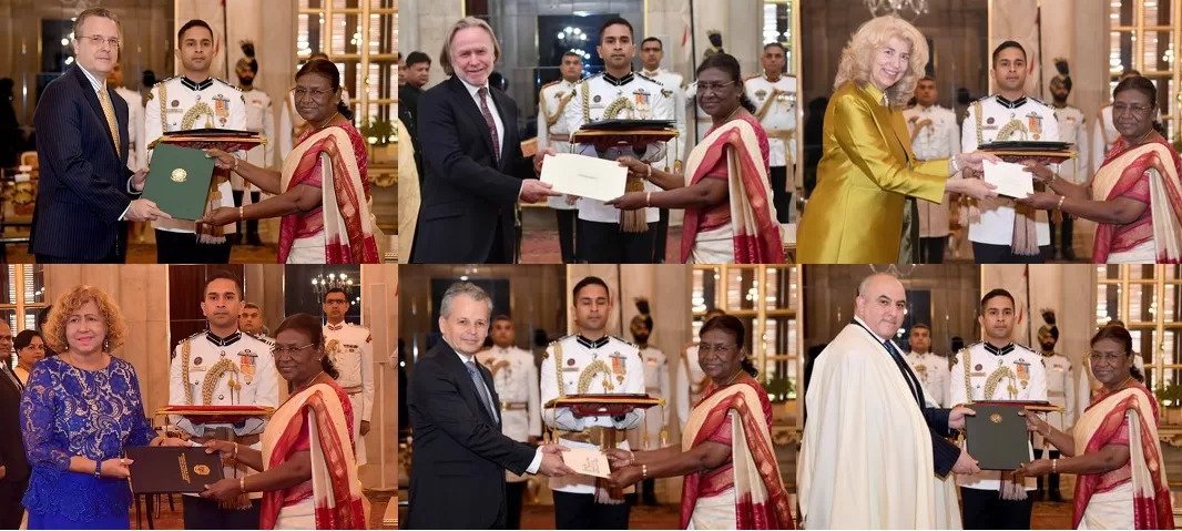 छह देशों के राजदूतों ने भारत के राष्ट्रपति को अपने परिचय पत्र किए प्रस्तुत`छह देशों के राजदूतों ने भारत के राष्ट्रपति को अपने परिचय पत्र किए प्रस्तुत