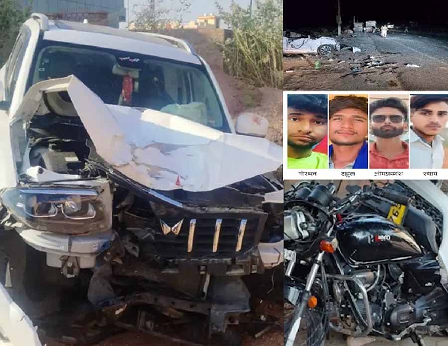 बीकानेर के नाल थाना क्षेत्र में एक भीषण सड़क हादसे में चार युवकों की जान चली गई। घटना शनिवार देर रात राष्ट्रीय राजमार्ग NH-11 (जैसलमेर रोड) पर हुई, जब एक तेज रफ्तार स्कॉर्पियो ने दो बाइकों को पीछे से टक्कर मार दी। इस दुर्घटना में तीन युवकों की मौके पर ही मौत हो गई, जबकि चौथे युवक ने अस्पताल में इलाज के दौरान दम तोड़ दिया।