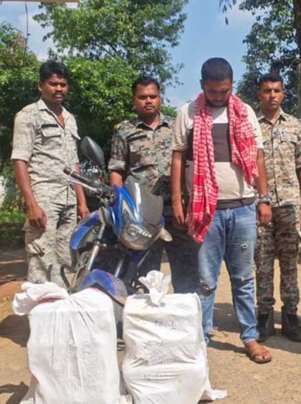 थाना फरसगांव पुलिस को मुखबीर से सूचना प्राप्त हुआ कि उड़ीसा, उमरकोट, माकड़ी की ओर से फरसगांव होते हुये रायपुर की ओर जा रही एक पुराना नीले रंग के टीव्हीएस अपाचे मोटर सायकल बिना नम्बर में अवैध मादक पदार्थ गांजा का परिवहन किया जा रहा है। सूचना पर फरसगांव पुलिस ने रांधना रोड़ में ग्राम पासंगी पुलिया के आगे फरसगांव माकड़ी मेन रोड में गुरूवार सुबह नाकेबंदी की गई जो मुखबीर के बताए अनुसार एक पुराना नीले रंग के टीव्हीएस अपाचे मोटर सायकल बिना नम्बर को रोककर हमराह स्टाफ के द्वारा तलाशी में मोटर सायकल के सामने टंकी में एक सफेद बोरी एवं पिटू बैग में 8 पैकेट गांजा मिला।