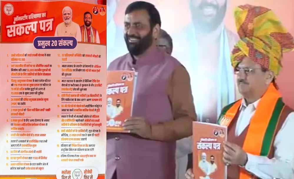 हरियाणा विधानसभा चुनाव के लिए BJP ने जारी किया संकल्प पत्र जारी, सभी महिलाओं को 2100 रुपये, 5 लाख रोजगार By Editor On Sep 19, 2024 37 Share Continue Reading featuredHaryana BJP Manifesto 2024 37 Share FacebookTwitterReddItWhatsAppPinterestEmail