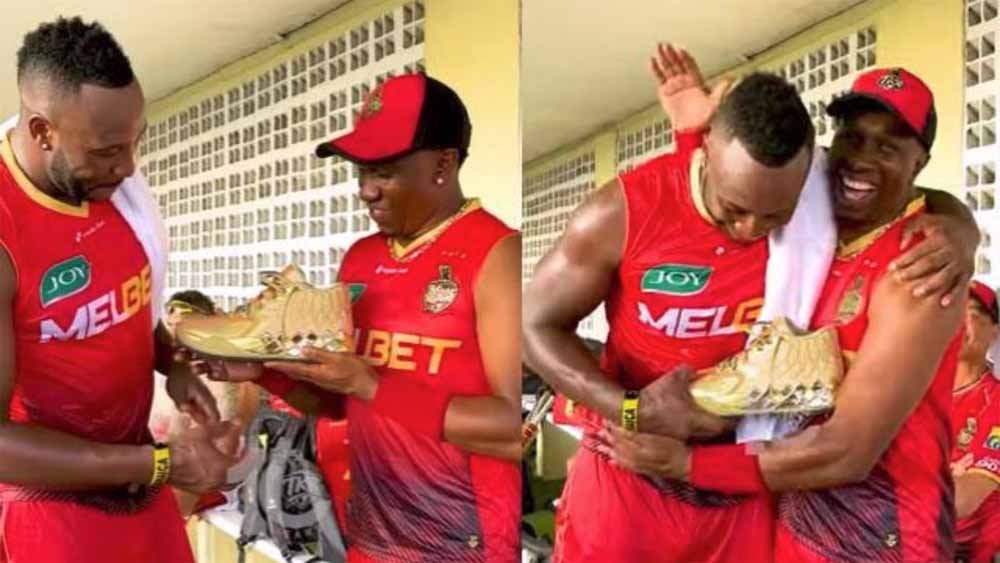 कैरिबियाई प्रीमियर लीग में एक मैच के दौरान ड्वेन ब्रावो ने आंद्रे रसल को अपना गोल्डन बूट गिफ्ट किया है। ब्रावो द्वारा गिफ्ट किए गए जूते को रसल ने बिना देरी किए पहना और उसी के साथ ट्रेनिंग भी की। ब्रावो द्वारा रसल को बूट देने का वीडियो सोशल मीडिया पर वायरल हो रहा है। ड्वेन ब्रावो ने हाल ही में कहा था कि कैरिबियाई प्रीमियर लीग के जारी सत्र के बाद इस टूर्नामेंट से संन्यास लेंगे।