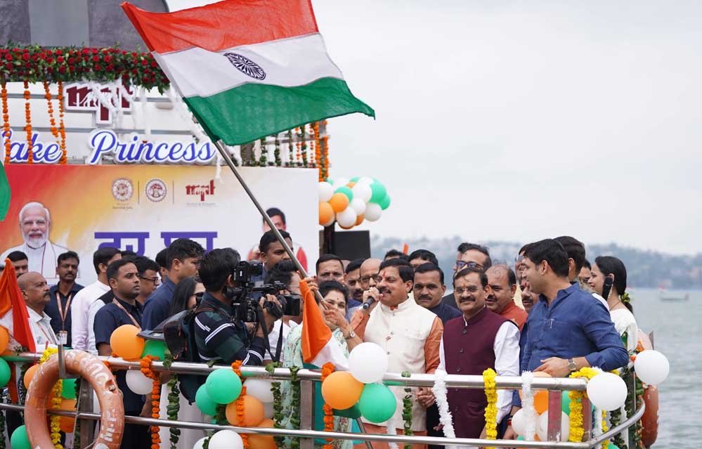 मुख्यमंत्री डॉ मोहन यादव ने वॉटर स्पोर्ट्स तिरंगा शो के अंतर्गत बड़े तालाब पर लेक प्रिंसेस क्रूज में ध्वज अभिवादन किया और तिरंगे की थीम बैलून छोड़े। वॉटर स्पोर्ट्स खिलाड़ियों द्वारा बड़े तालाब में देश भक्ति की धुनों के बीच तिरंगे के साथ विशेष फॉर्मेशन निर्मित की गई। मुख्यमंत्री डॉ यादव ने पूरे जोश के साथ देशभक्ति गीत ‘यह देश है वीर जवानों का’ गाया और बड़े तालाब में नावों पर सवार नृतक और नृत्यांगनाओं ने गीत की धुन पर नृत्य प्रस्तुत किया।