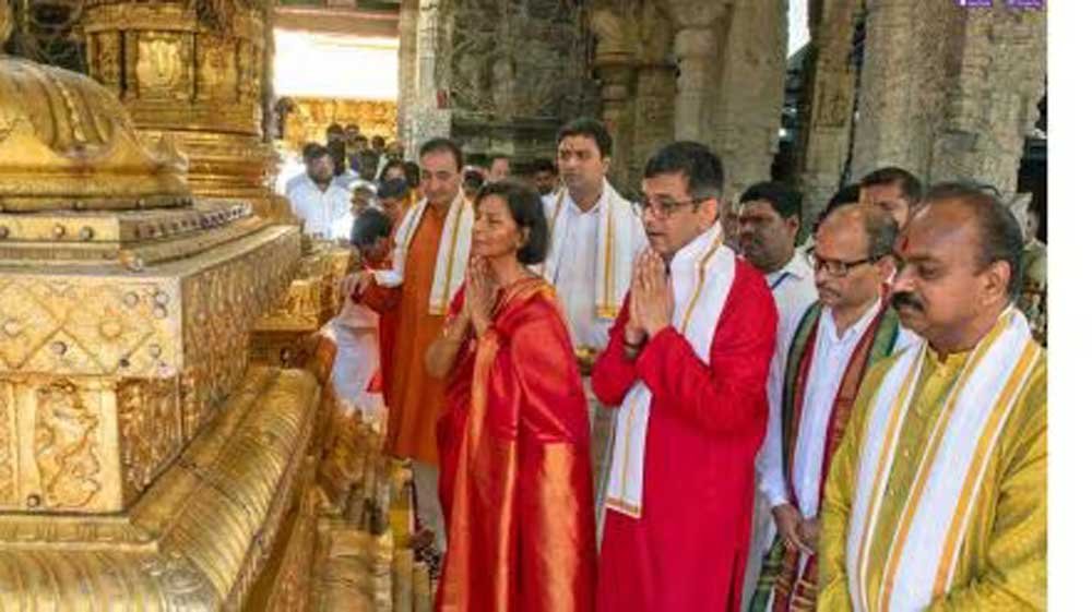 खास वैकुंठ पंक्ति से मंदिर में प्रवेश करने के बाद सीजेआई गर्भगृह में पहुंचे और भगवान वेंकटेश की पूजा की। दर्शन के बाद सीजेआई चंद्रचूड़ और उनके परिवार को रंगनायकुला मंडपम के पुजारी ने आशीर्वाद दिया। टीटीडी के कार्यकारी अधिकारी जे श्यामला राव ने उन्हें भगवान वेंकटेश का पोर्ट्रेट और प्रसाद दिया।