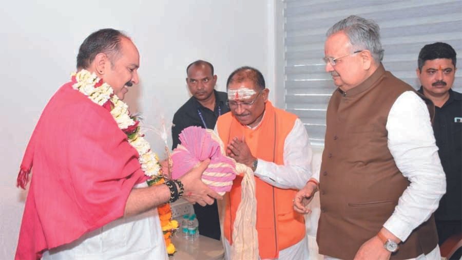 सीएम साय और विधानसभा अध्यक्ष डॉ. रमन सिंह ने कथावाचक प्रदीप मिश्रा को स्मृति चिन्ह के रूप में भेंट की नंदी की मूर्ति