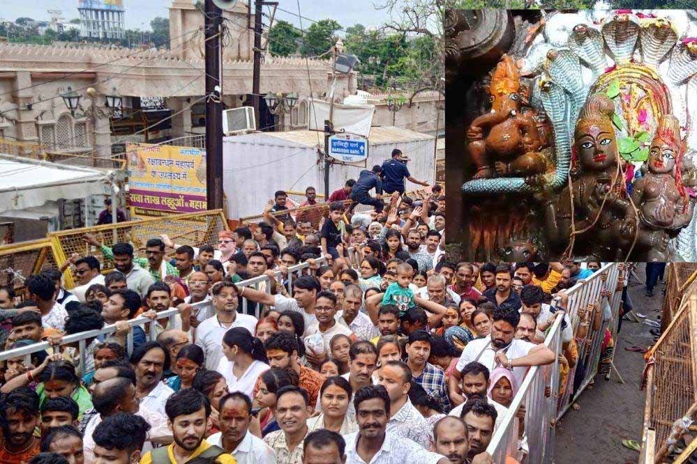 महाकालेश्वर मंदिर में नागपंचमी पर्व मनाया जा रहा है. नागचन्द्रेश्वर भगवान के पट रात्रि 12 बजे खुले और शुक्रवार की रात 12 बजे तक खुले रहेंगे. जिसमें लाखों की संख्या में श्रद्धालुओं के आने की संभावना जताई गई है. इसी के साथ श्रद्धालुओं के लिए तमाम प्रकार की व्यवस्थाएं भी प्रशासन द्वारा की गईं हैं. कम से कम समय में दर्शन हो इसकी व्यवस्था प्रशासन ने की है. वहीं शीघ्र दर्शन करने वालों के लिए ऑनलाइन टिकट बुकिंग करने की व्यवस्था भी की गई है.