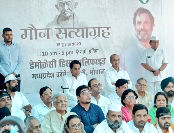 पीसीसी मुख्यालय के बाहर बड़ी संख्या में कांग्रेस कार्यकर्ता काला बिल्ला लगाकर मौन सत्याग्रह पर बैठे हैं। पूर्व मुख्यमंत्री कमलनाथ, कांग्रेस के प्रदेश प्रभारी जेपी अग्रवाल, पूर्व केंद्रीय मंत्री अरुण यादव समेत तमाम सीनियर नेता इस सत्याग्रह में शामिल हुए। सत्याग्रह शुरू होने से पूर्व कांग्रेस नेताओं ने कहा कि राहुल गांधी को संसद से बाहर रखने का जो षड्यंत्र रचा गया है, उसके खिलाफ कांग्रेस देशव्यापी मौन सत्याग्रह कर रही है।