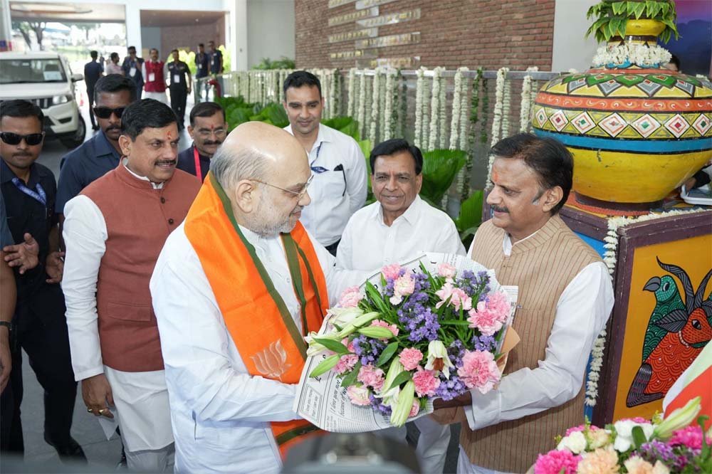 गृहमंत्री अमित शाह पहुंचे मध्य प्रदेश स्टेट हैंगर पर उनका मुख्यमंत्री डॉ. मोहन यादव ने पुष्प गुच्छ देकर किया स्वागत