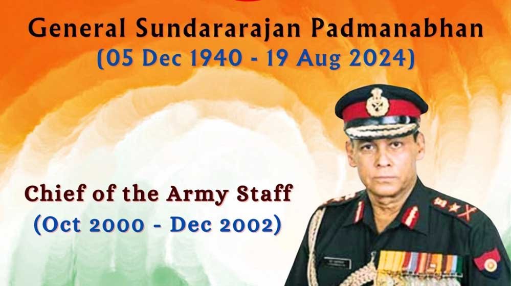 पूर्व सेना प्रमुख जनरल सुंदरराजन पद्मनाभन का चेन्नई में 83 साल की उम्र में निधन हो गया। जनरल पद्मनाभन को सैन्य हलकों में प्यार से ‘पैडी’ के नाम से जाना जाता था। उन्होंने 30 सितंबर 2000 से 31 दिसंबर 2002 तक थल सेनाध्यक्ष के रूप में सेवाएं दी थीं। दिल्ली में प्रतिष्ठित राष्ट्रीय रक्षा कॉलेज (एनडीसी) में शामिल होने से पहले जनरल पद्मनाभन ने एक स्वतंत्र तोपखाना ब्रिगेड और एक ‘माउंटेन ब्रिगेड’ की कमान संभाली थी। 15 कोर के कमांडर के रूप में उनकी सेवाओं के लिए उन्हें अति विशिष्ट सेवा पदक (एवीएसएम) से सम्मानित किया गया था।