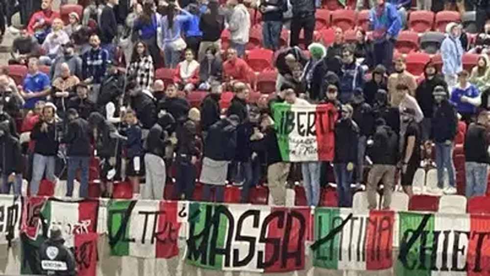 इटली के इन प्रशंसकों ने सोमवार को खेले गए इस मैच में अपने देश का ध्वज भी हाथ में ले रखा था जिस पर ‘लिबर्टा’ (स्वतंत्रता) लिखा हुआ था। हमास के साथ युद्ध के कारण इज़राइल अपने घरेलू मैच हंगरी में खेल रहा है। इटली ने इस मैच में 3-0 से जीत दर्ज की।