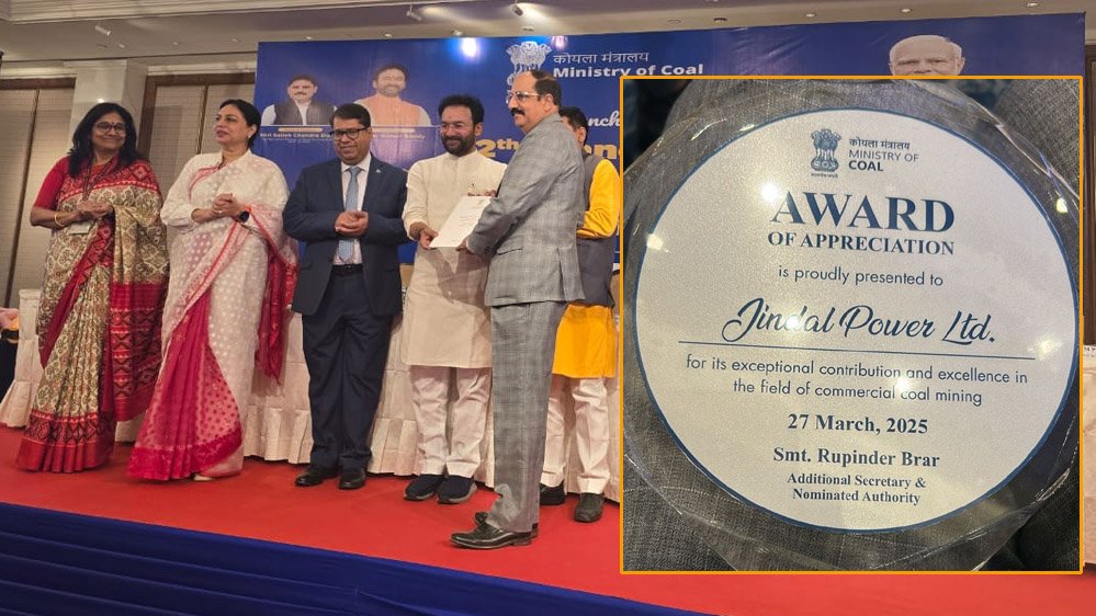 भारत सरकार के कोयला मंत्रालय ने वाणिज्यिक कोयला खनन क्षेत्र में असाधारण योगदान और उत्कृष्टता के लिए जिंदल पावर लिमिटेड को सम्मानित किया गया हैं।जो कि देश का लगभग 90%कमर्शियल उत्पादन वाणिज्य कोयले उत्पादन किया हैं,जो देश में सबसे अधिक राजस्व योगदान कर्ता के रूप में उभरा हैं,यह पुरस्कार दिल्ली में माननीय केंद्रीय कोयला और खनन मंत्री श्री किशन रेड्डी द्वारा प्रदान किया गया।