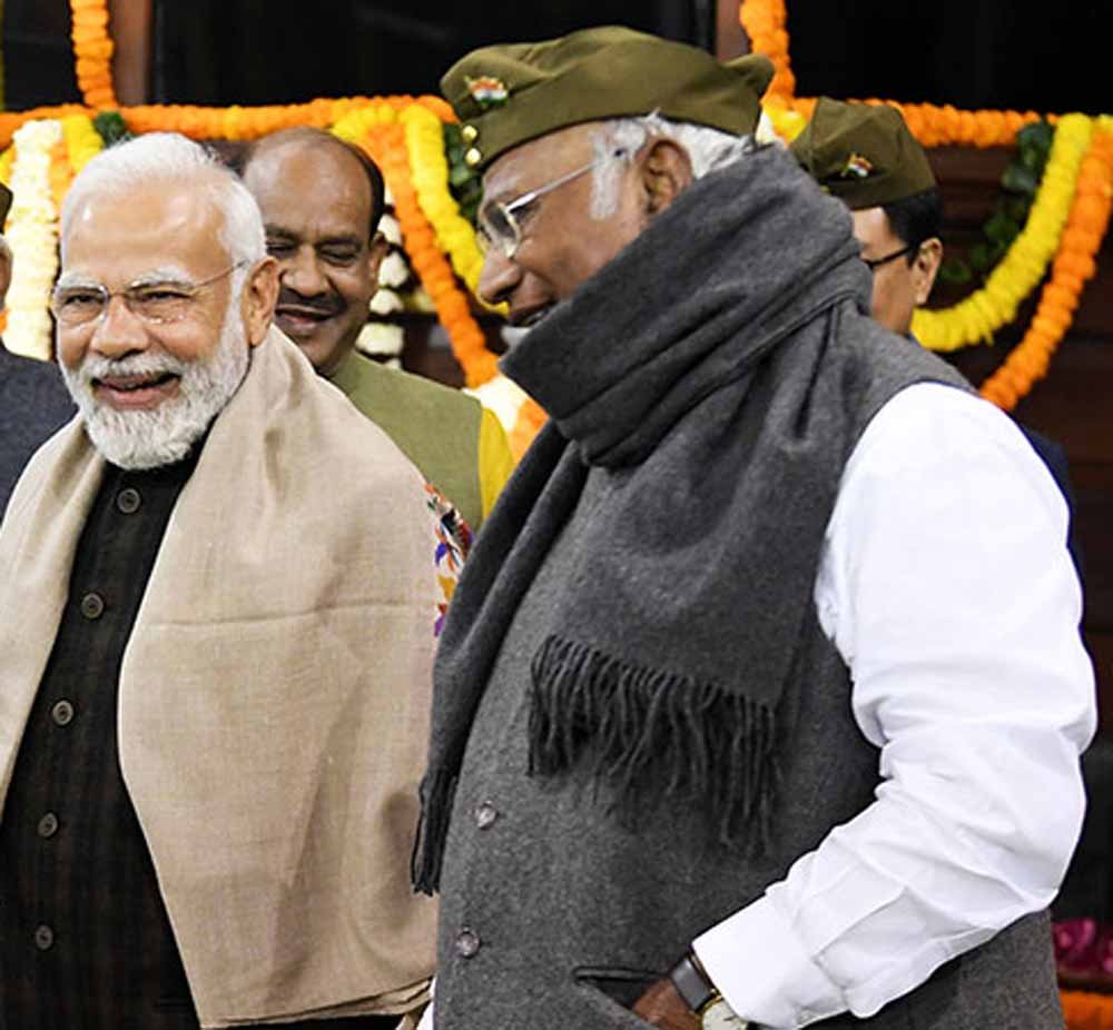 पीएम मोदी संग ऐसा दिखा खरगे का अंदाज, हाथ में हाथ और हंसी-मजाक, की हस्ते हुए बात, बिरला-धनखड़ भी साथ
