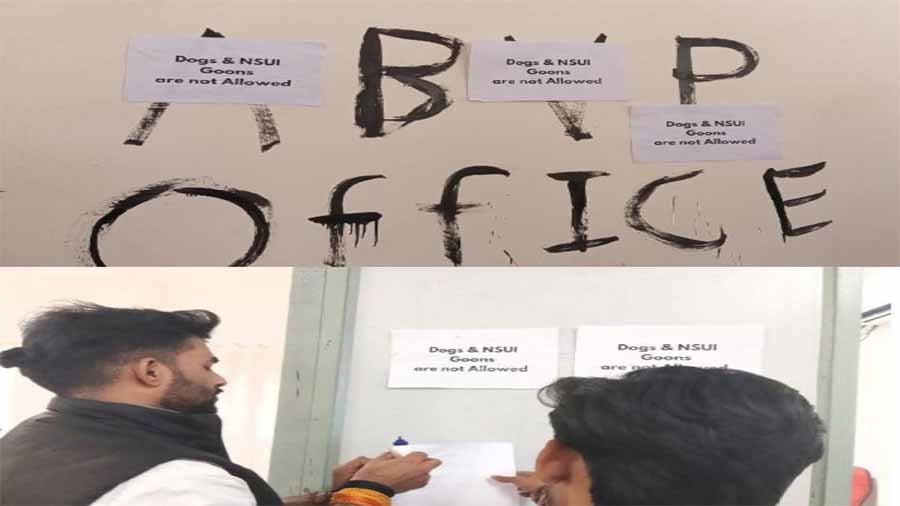 दरअसल एनएसयूआई (NSUI) के विरोध के बाद एबीवीपी (ABVP) के बीच पोस्टर वॉर शुरू हो गया है। विश्वविद्यालय में लगे पोस्टर के फोटो वायरल हुआ है। वायरल फोटो में लिखा है Dogs & Nsui Goons Not Allowed। मामले को लेकर एनएसयूआई के एमसीयू प्रभारी तनय शर्मा बोले- एक तरफ सरकार अपने 1 साल का जश्न मना रही है और वहीं माखनलाल चतुर्वेदी विश्वविद्यालय परिसर में अंग्रेजों का शासन कायम नजर आ रहा है। सरकार से अपील है भेदभाव करने वाले विश्वविद्यालय के अधिकारियों के खिलाफ करवाई हो। एबीवीपी की इकाई गठन कार्यक्रम में महत्पूर्ण पदों पर बैठे विश्वविद्यालय के अधिकारीयों का शामिल होना भेदभाव दर्शाता है और चिंताजनक है।