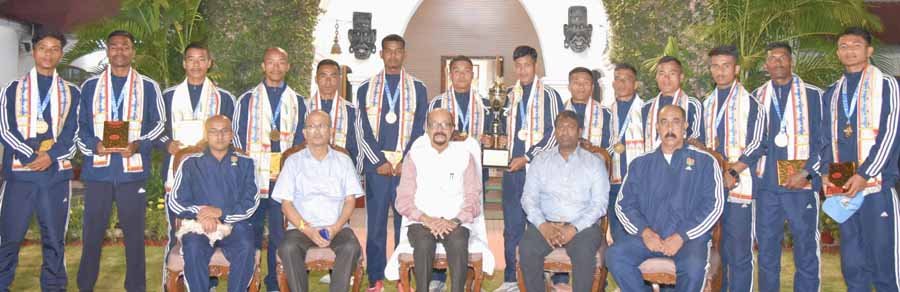 राज्यपाल श्री रमेन डेका से 27वीं अखिल भारतीय वन खेलकूद प्रतियोगिता में भाग लेने वाले असम के फुटबॉल टीम के खिलाडियों ने श्री सनीदेव चौधरी, (आईएफएस) और श्री तेजस एम, (आईएफएस) के नेतृत्व में सौजन्य मुलाकात की। उनके साथ टीम कोच श्री दगंता बोरा भी उपस्थित थे। उल्लेखनीय है कि असम की टीम ने इस प्रतियोगिता में पहली बार फुटबॉल में स्वर्ण पदक प्राप्त किया है।