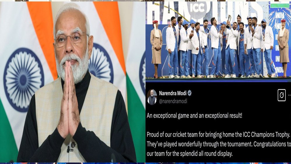 भारतीय टीम की जीत पर प्रधानमंत्री नरेंद्र मोदी ने एक्स पर पोस्ट कर लिखा, ‘एक असाधारण खेल और एक असाधारण परिणाम। आईसीसी चैंपियंस ट्रॉफी घर लाने के लिए हमारी क्रिकेट टीम पर गर्व है। उन्होंने पूरे टूर्नामेंट में शानदार प्रदर्शन किया है। शानदार प्रदर्शन के लिए हमारी टीम को बधाई’।