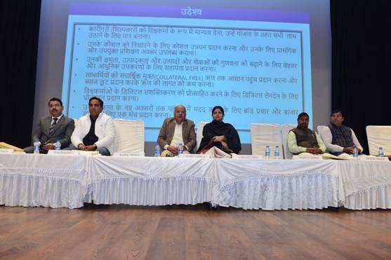 एमएसएमई मंत्रालय की तरफ से डॉ. इशिता गांगुली त्रिपाठी, एडिशनल डेवलपमेंट कमिश्नर ने अपने वक्तव्य के दौरान कहा कि यह योजना 17 सितंबर 2023 को आदरणीय प्रधानमंत्री जी के द्वारा लॉन्च की गई थी तथा इस योजना में कारीगरों को 15000/- तक की टूल किट और 3 लाख रुपये तक की राशि 5% ब्याज पर बिना जमानत के ऋण, मुफ्त प्रशिक्षण एवं प्रशिक्षण के दौरान 500 रुपये दैनिक भत्ता, विपणन सहायता, प्रमाण पत्र और कारीगर पहचान पत्र प्रदान किए जायेंगे I उन्होंने यह भी बताते हुए ख़ुशी जाहिर की कि पंजीकरण में महिलाओ कि भागीदारी 55% है और सभी से आह्वान किया कि इस योजना का लाभ उठाकर सब आत्मनिर्भर बने और अपना उद्यम स्थापित करे तथा विकसित भारत में अपना योगदान बढ़ाए|