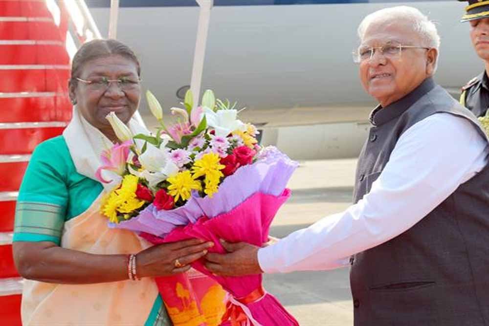 राष्ट्रपति श्रीमती द्रौपदी मुर्मु का राज्यपाल श्री मंगुभाई पटेल और मुख्यमंत्री डॉ. मोहन यादव ने किया स्वागत