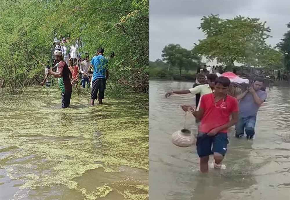 दौसा जिले की लवाण तहसील के गिरधरपुरा गांव में एक हृदय विदारक घटना सामने आई। यहां 36 वर्षीय पायलट खारवाल का लंबी बीमारी के बाद निधन हो गया और अंतिम संस्कार के लिए ले जाते वक्त मृतक के परिजनों को ढाई फीट गहरे पानी और कीकर-बबूल के बीच से होकर गुजरना पड़ा, क्योंकि यहां दबंगों का राज चल रहा है। सरपंच मजबूर हैं और प्रशासन बेबस। जवान बेटे की मौत का सदमा और ऊपर से अंतिम संस्कार के लिए इतनी जद्दोजहद ने परिवार को तोड़कर रख दिया।