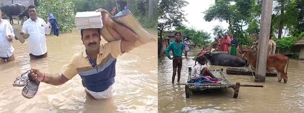 नेपाल में हुई भारी बारिश का असर दरभंगा जिला में साफ साफ दिखने लगा है।  जमालपुर के भूभौल गांव में देर रात कोसी के तटबंध के टूटने के बाद दर्जनो गांव में बाढ़ का पानी घुस गया है जिससे ग्रामीणों का जनजीवन प्रभावित दिखने लगा है। आज इसी बाढ़ ग्रस्त इलाके के तिकेश्वरस्थान थाना क्षेत्र के प्राथमिक विद्यालय के शिक्षक अपनी जान को जोखिम में डालकर मूल्यांकन करने अपने स्कूल निकल पड़े है। मूल्यांकन कार्य मे लगे शिक्षक अपने माथे पर जांचने वाली कॉपी और हाथों में अपने चप्पल जूते और कंधे पर अपना बैंग टांगकर जान को जोखिम में डालते हुए अपने ड्यूटी का पालन करने जाते दिख रहे है।