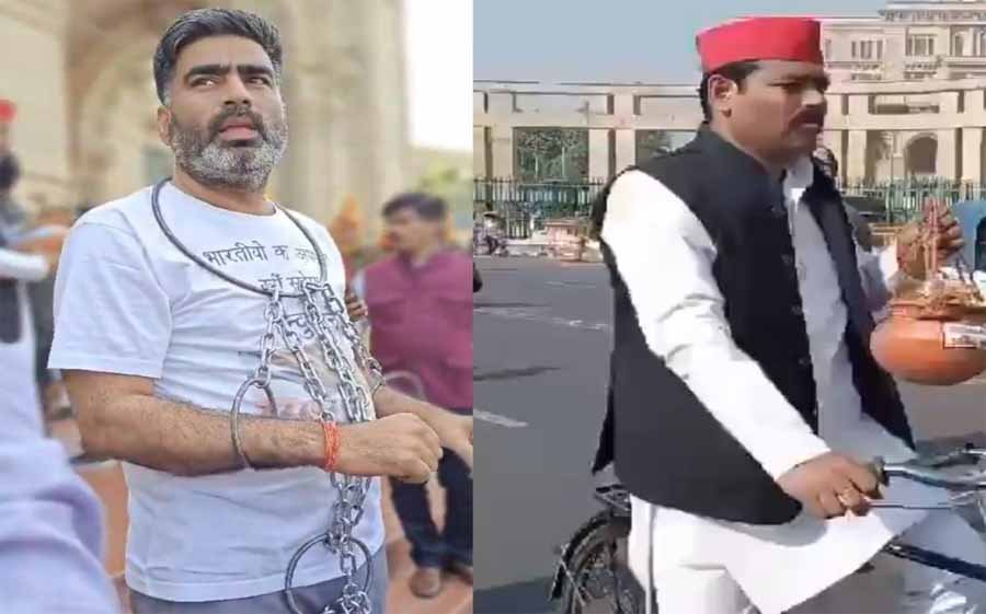 आज मंगलवार से यूपी विधानसभा का बजट सत्र शुरु हो रहा है. सत्र शुरु होने से पहले ही समाजवादी पार्टी के विधायक विधानसभा के बाहर प्रर्दशन किए. इधर सत्र शुरु होने से पहले सपा विधायक अतुल प्रधान और MLC आशुतोष सिन्हा ने अनोखा विरोध प्रदर्शन किया.