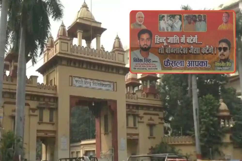 वाराणसी में काशी हिंदू विश्वविद्यालय (बीएचयू) के मुख्य द्वार के बाहर भारतीय जनता युवा मोर्चा ने एक विशाल बैनर लगाया है। इस बैनर पर लिखा है, “हिंदू जाति में बटेंगे तो बांग्लादेश जैसा कटेंगे… फैसला आपका।”