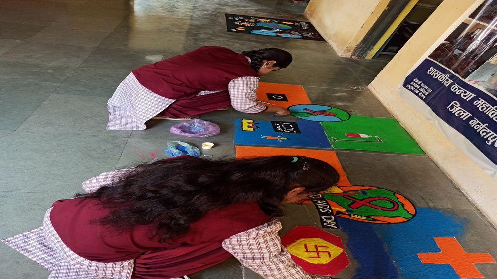 छात्राओं ने रंगोली के माध्यम से एड्स बीमारी के कारण एवं रोकथाम को सुंदर रंगोली के द्वारा प्रदर्शित किया