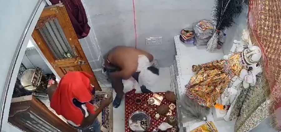 घटना बीती रात करीब 11.05 बजे की है। एक-एक करके तीन चोर मंदिर के गेट पर लगा तोड़कर गर्भगृह में घुसे। चोर माताजी के मंदिर के पास रखी तलवार और मूर्ति शृंगारित विभिन्न प्रकार के सामान उतारकर ले गए। यह पूरी वारदात सीसीटीवी कैमरे में रिकॉर्ड हो गई। वीडियो में देखा जा सकता है कि किसी भी चोर ने शर्ट नहीं पहन रखी है। इसके साथ ही इन सबके मुंह ढके हुए हैं। मंदिर पुजारी सवेरे रोजाना की तरह यहां पूजा करने पहुंचे तो गर्भगृह के गेट पर लगा ताला टूटा हुआ मिला। इसके साथ ही वहां सारा सामान बिखरा हुआ था। उन्होंने ग्रामीणों और रीको पुलिस थाना को घटना की जानकारी दी।